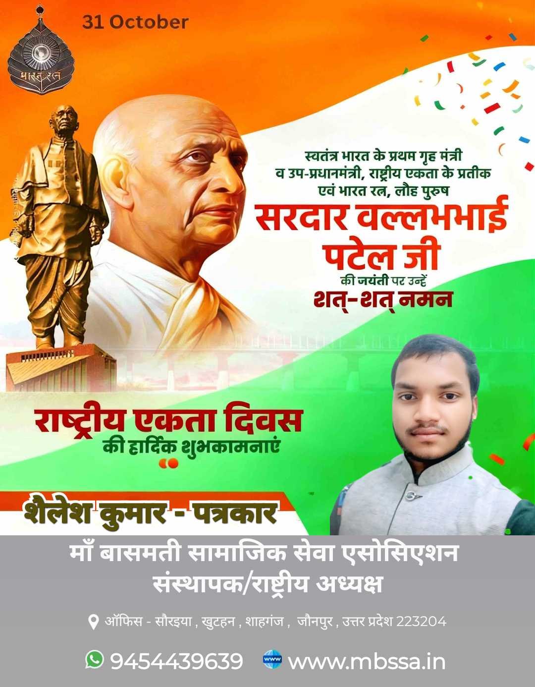 🇮🇳 31 अक्टूबर — राष्ट्रीय एकता दिवस 🇮🇳 #NationalUnityDay #EkBharatShreshthaBharat आज का दिन हमारे महान भारत रत्न, लौह पुरुष सरदार वल्लभभाई पटेल जी की जयंती के रूप में मनाया जाता है। यह दिवस हमें एकता, अखंडता और राष्ट्र की मजबूती का संदेश देता है। आइए संकल्प लें — 👉 “एक भारत — श्रेष्ठ भारत” के सपने को साकार करें और समाज में एकजुटता, भाईचारा व राष्ट्रप्रेम की भावना को मजबूत बनाएं। 🙏 राष्ट्रीय एकता दिवस की हार्दिक शुभकामनाएं! 🙏 ✍️ शैलेश कुमार - पत्रकार संस्थापक / राष्ट्रीय अध्यक्ष माँ बासमती सामाजिक सेवा एसोसिएशन (MBSSA) 📍 ऑफिस: सौरैया, खुटहन, शाहगंज, जौनपुर (उ.प्र.) 📞 9454439639 | 🌐 www.mbssa.in #MBSSA #ShaileshKumar #SardarVallabhbhaiPatel #RashtriyaEktaDiwas #IndiaUnity #SocialService #MBSSAWorks #ProudToBeIndian