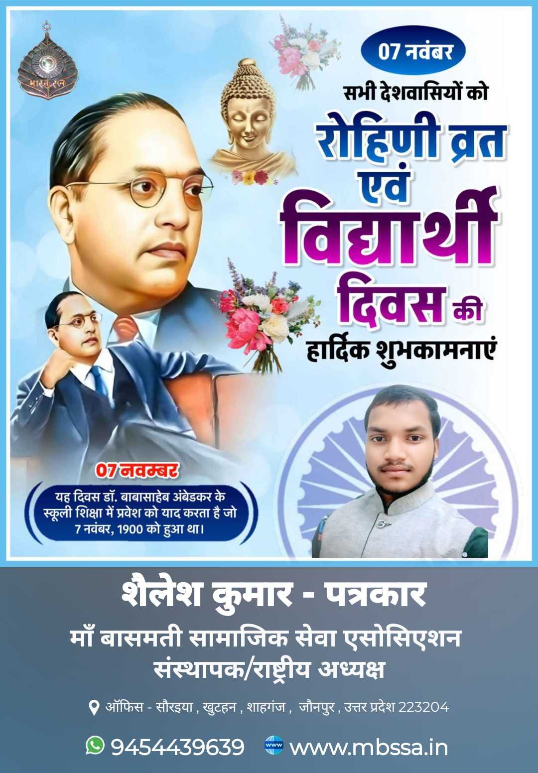 आज दिनांक 07 नवम्बर को “रोहिणी व्रत एवं विद्यार्थी दिवस” के पावन अवसर पर मैं, शैलेश कुमार (पत्रकार) — संस्थापक / राष्ट्रीय अध्यक्ष, माँ बासमती सामाजिक सेवा एसोसिएशन (MBSSA) — समस्त देशवासियों, विद्यार्थियों एवं युवाशक्ति को हार्दिक शुभकामनाएँ प्रेषित करता हूँ। यह दिवस भारत रत्न डॉ. भीमराव अम्बेडकर जी के विद्यालयी शिक्षा में प्रथम प्रवेश दिवस (7 नवम्बर 1900) की स्मृति में मनाया जाता है। यह दिन हम सभी को शिक्षा के महत्व, समान अवसरों की आवश्यकता और सामाजिक न्याय के मूल्यों की ओर प्रेरित करता है। डॉ. अम्बेडकर जी ने अपने जीवन से यह सिद्ध किया कि शिक्षा ही वह शक्ति है जो व्यक्ति, समाज और राष्ट्र — तीनों के उत्थान का माध्यम बन सकती है। हम सभी का दायित्व है कि हम उनके बताए मार्ग पर चलते हुए ज्ञान, सत्य और करुणा के पथ पर अग्रसर हों। आज के इस पवित्र अवसर पर मैं समस्त विद्यार्थियों से आह्वान करता हूँ कि वे अपने अध्ययन को समाज निर्माण का आधार बनाएं और डॉ. अम्बेडकर जी के सपनों का भारत बनाने में सक्रिय भूमिका निभाएँ। जय भीम। जय भारत। शैलेश कुमार (पत्रकार) संस्थापक / राष्ट्रीय अध्यक्ष माँ बासमती सामाजिक सेवा एसोसिएशन (MBSSA) कार्यालय: सौरैया, खुटहन, शाहगंज, जनपद – जौनपुर (उ.प्र.) – 223204 📞 9454439639 🌐 www.mbssa.in
