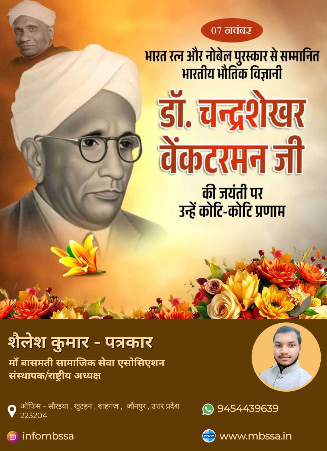 आज दिनांक 07 नवम्बर को भारत रत्न एवं नोबेल पुरस्कार से सम्मानित महान भारतीय भौतिक वैज्ञानिक डॉ. चन्द्रशेखर वेंकटरमन जी की जयंती के शुभ अवसर पर माँ बासमती सामाजिक सेवा एसोसिएशन (MBSSA) परिवार की ओर से उन्हें कोटि-कोटि नमन एवं श्रद्धांजलि अर्पित की गई। डॉ. वेंकटरमन जी का योगदान भारतीय विज्ञान जगत के इतिहास में अमिट एवं प्रेरणादायी है। उन्होंने “रमन प्रभाव” के माध्यम से सम्पूर्ण विश्व में भारत का नाम ऊँचा किया। उनके कार्यों ने विज्ञान के क्षेत्र में नई दिशा प्रदान की और भारत को गौरवान्वित किया। इस अवसर पर श्री शैलेश कुमार (पत्रकार), संस्थापक/राष्ट्रीय अध्यक्ष, माँ बासमती सामाजिक सेवा एसोसिएशन (MBSSA) ने कहा कि – > “डॉ. रमन जी का जीवन हमें यह सिखाता है कि सीमित संसाधनों में भी असीम सफलता प्राप्त की जा सकती है। युवा पीढ़ी को उनके आदर्शों से प्रेरणा लेकर राष्ट्र निर्माण में योगदान देना चाहिए।” संस्था के समस्त पदाधिकारियों एवं सदस्यों ने भी उनके चित्र पर पुष्प अर्पित कर श्रद्धांजलि दी तथा उनके बताए मार्ग पर चलने का संकल्प लिया। शैलेश कुमार – पत्रकार संस्थापक/राष्ट्रीय अध्यक्ष माँ बासमती सामाजिक सेवा एसोसिएशन (MBSSA) ऑफिस – सौरैया, खुटहन, शाहगंज, जौनपुर (उ.प्र.) – 223204 📞 94544 39639 | 🌐 www.mbssa.in माँ बासमती सामाजिक सेवा एसोसिएशन 094544 39639 Jaunpur Police