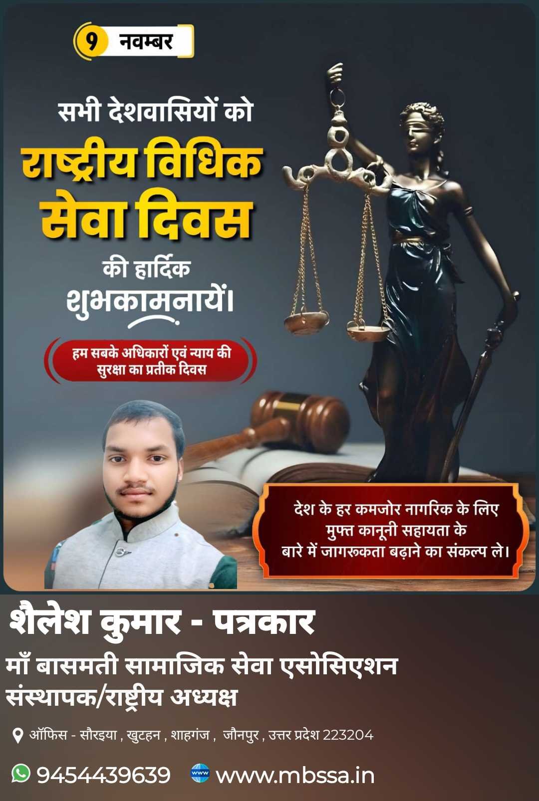 राष्ट्रीय विधिक सेवा दिवस के अवसर पर देश के सभी नागरिकों को हार्दिक शुभकामनाएँ श्री शैलेश कुमार संस्थापक / राष्ट्रीय अध्यक्ष, माँ बासमती सामाजिक सेवा एसोसिएशन ने कहा कि “यह दिवस हम सबके अधिकारों एवं न्याय की सुरक्षा का प्रतीक है। प्रत्येक नागरिक को अपने विधिक अधिकारों की जानकारी होना अत्यंत आवश्यक है। देश के प्रत्येक कमजोर एवं वंचित वर्ग के नागरिकों को निःशुल्क कानूनी सहायता प्राप्त कराने हेतु जागरूकता बढ़ाना हम सबका कर्तव्य है।” उन्होंने यह भी कहा कि संगठन निरंतर जनहित एवं सामाजिक न्याय की दिशा में कार्यरत है और आगे भी समाज के प्रत्येक वर्ग तक न्याय एवं अधिकारों की पहुँच सुनिश्चित करने हेतु प्रयासरत रहेगा। शैलेश कुमार(संस्थापक / राष्ट्रीय अध्यक्ष) माँ बासमती सामाजिक सेवा एसोसिएशन 📞 9454439639 | 🌐 www.mbssa.in #राष्ट्रीयविधिकसेवादिवस ⚖️ #विधिकसहायताजागरूकता #न्यायकासंवर्धन #कानूनीसहायता #सामाजिकन्याय #लोककल्याण #हरनागरिककोन्याय #MBSSA #MBSSAIndia #माँबासमतीसामाजिकसेवाएसोसिएशन #शैलेशकुमारपत्रकार #न्यायकासंकल्प 🚩 #राष्ट्रीयविधिकसेवादिवस #विधिकसहायताजागरूकता #न्यायकासंवर्धन #सामाजिकन्याय #कानूनीसहायता #न्यायकाअधिकार #लोककल्याण #जनजागरूकता #माँबासमतीसामाजिकसेवाएसोसिएशन #MBSSA #MBSSAजौनपुर #MBSSAIndia #शैलेशकुमारपत्रकार #सामाजिकसेवा