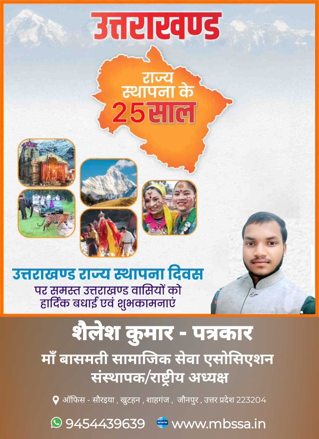 उत्तराखण्ड राज्य के गौरवमयी 25 वर्ष पूर्ण होने पर समस्त उत्तराखण्डवासियों को हार्दिक बधाई एवं शुभकामनाएँ। 🇮🇳 राज्य की समृद्ध सांस्कृतिक धरोहर, प्राकृतिक सौन्दर्य एवं वीरता का इतिहास हम सभी के लिए गर्व का विषय है। आइए, हम सब मिलकर प्रदेश के सर्वांगीण विकास एवं प्रगति में सहभागी बनें। शैलेश कुमार – पत्रकार संस्थापक / राष्ट्रीय अध्यक्ष माँ बासमती सामाजिक सेवा एसोसिएशन (MBSSA) ऑफिस – सौरईया, खुंटहन, शाहगंज, जौनपुर (उ.प्र.) 📞 9454439639 🌐 www.mbssa.in #उत्तराखण्ड #राज्य_स्थापना_दिवस #25साल_उत्तराखण्ड #उत्तराखण्ड_गौरव #MBSSA #ShaileshKumar #पत्रकार #सामाजिकसेवा #भारत_मां_की_जय #उत्तराखण्ड_विकास #GovernmentStyle #UttarakhandFoundationDay #माँबासमतीसामाजिकसेवाएसोसिएशन #MBSSA #MBSSAजौनपुर #MBSSAIndia #शैलेशकुमारपत्रकार #सामाजिकसेवा