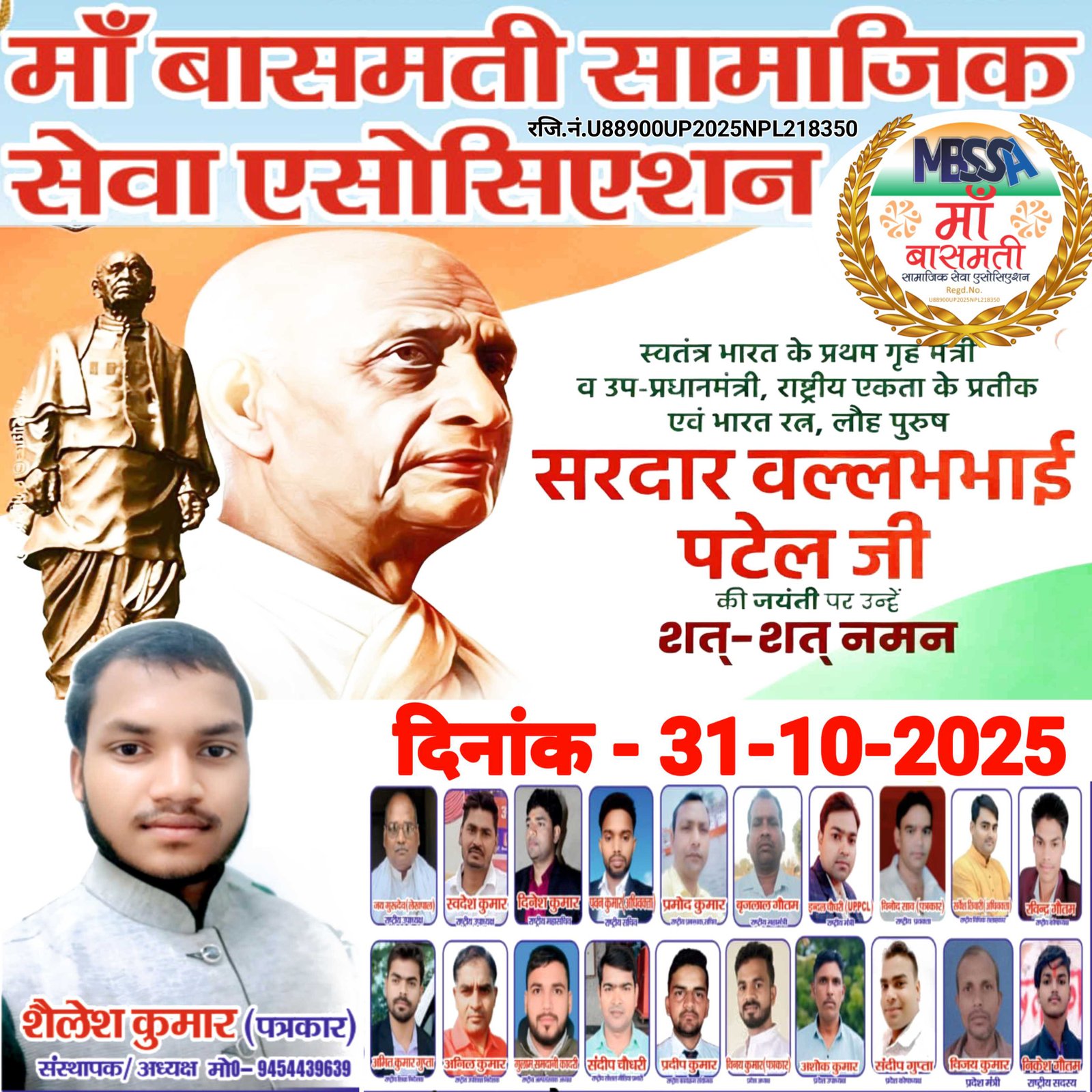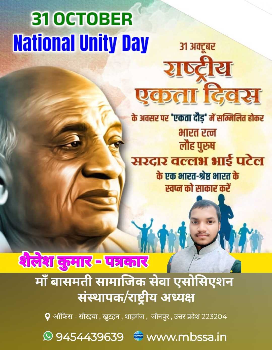 🇮🇳 31 अक्टूबर — राष्ट्रीय एकता दिवस 🇮🇳 #NationalUnityDay #EkBharatShreshthaBharat आज का दिन हमारे महान भारत रत्न, लौह पुरुष सरदार वल्लभभाई पटेल जी की जयंती के रूप में मनाया जाता है। यह दिवस हमें एकता, अखंडता और राष्ट्र की मजबूती का संदेश देता है। आइए संकल्प लें — 👉 “एक भारत — श्रेष्ठ भारत” के सपने को साकार करें और समाज में एकजुटता, भाईचारा व राष्ट्रप्रेम की भावना को मजबूत बनाएं। 🙏 राष्ट्रीय एकता दिवस की हार्दिक शुभकामनाएं! 🙏 ✍️ शैलेश कुमार - पत्रकार संस्थापक / राष्ट्रीय अध्यक्ष माँ बासमती सामाजिक सेवा एसोसिएशन (MBSSA) 📍 ऑफिस: सौरैया, खुटहन, शाहगंज, जौनपुर (उ.प्र.) 📞 9454439639 | 🌐 www.mbssa.in #MBSSA #ShaileshKumar #SardarVallabhbhaiPatel #RashtriyaEktaDiwas #IndiaUnity #SocialService #MBSSAWorks #ProudToBeIndian