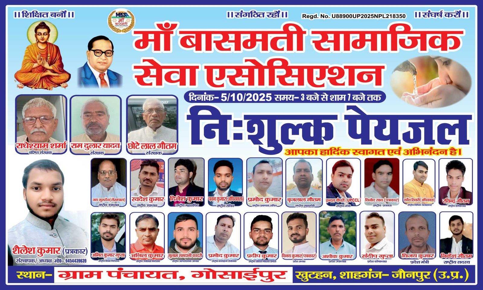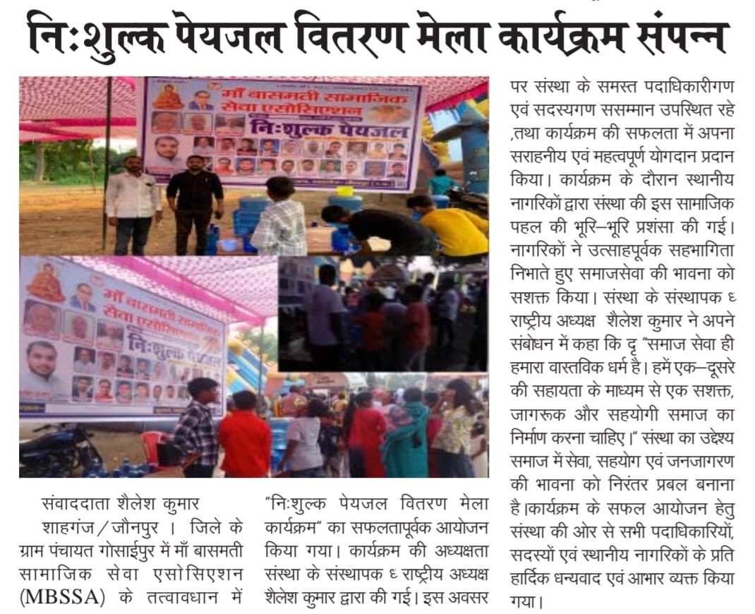 सूचना माँ बासमती सामाजिक सेवा एसोसिएशन (MBSSA) द्वारा आयोजित 🌸 गोसाईपुर मेला –05 / 10 / 2025 🌸 📍 स्थान : गोसाईपुर मेला परिसर दिनांक : 05 अक्टूबर 2025 समय - दोपहर 3 :00 बजे से शाम 7 :00 बजे तक 👉 इस अवसर पर संगठन द्वारा 💧 निःशुल्क पेयजल की व्यवस्था भी की जाएगी, ताकि मेले में आने वाले सभी आगंतुकों को शुद्ध व ठंडा पानी उपलब्ध हो सके। ✨ “सेवा ही हमारा धर्म, शिक्षा ही हमारा उद्देश्य” समस्त सम्मानित पदाधिकारियों से निवेदन कि प्रोग्राम में पहुंच कर प्रोग्राम सफल बनने में सहयोग करे। धन्यवाद।