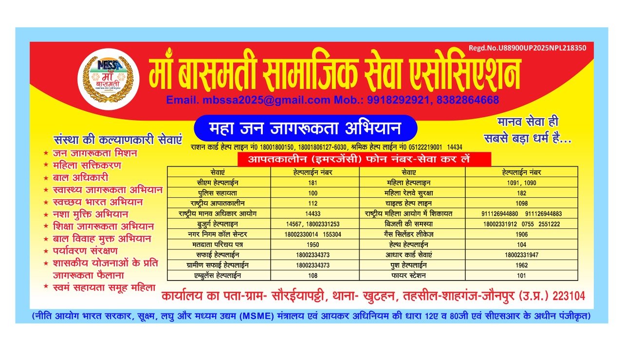 राष्ट्रीय विधिक सेवा दिवस के अवसर पर देश के सभी नागरिकों को हार्दिक शुभकामनाएँ श्री शैलेश कुमार संस्थापक / राष्ट्रीय अध्यक्ष, माँ बासमती सामाजिक सेवा एसोसिएशन ने कहा कि “यह दिवस हम सबके अधिकारों एवं न्याय की सुरक्षा का प्रतीक है। प्रत्येक नागरिक को अपने विधिक अधिकारों की जानकारी होना अत्यंत आवश्यक है। देश के प्रत्येक कमजोर एवं वंचित वर्ग के नागरिकों को निःशुल्क कानूनी सहायता प्राप्त कराने हेतु जागरूकता बढ़ाना हम सबका कर्तव्य है।” उन्होंने यह भी कहा कि संगठन निरंतर जनहित एवं सामाजिक न्याय की दिशा में कार्यरत है और आगे भी समाज के प्रत्येक वर्ग तक न्याय एवं अधिकारों की पहुँच सुनिश्चित करने हेतु प्रयासरत रहेगा। शैलेश कुमार(संस्थापक / राष्ट्रीय अध्यक्ष) माँ बासमती सामाजिक सेवा एसोसिएशन 📞 9454439639 | 🌐 www.mbssa.in #राष्ट्रीयविधिकसेवादिवस ⚖️ #विधिकसहायताजागरूकता #न्यायकासंवर्धन #कानूनीसहायता #सामाजिकन्याय #लोककल्याण #हरनागरिककोन्याय #MBSSA #MBSSAIndia #माँबासमतीसामाजिकसेवाएसोसिएशन #शैलेशकुमारपत्रकार #न्यायकासंकल्प 🚩 #राष्ट्रीयविधिकसेवादिवस #विधिकसहायताजागरूकता #न्यायकासंवर्धन #सामाजिकन्याय #कानूनीसहायता #न्यायकाअधिकार #लोककल्याण #जनजागरूकता #माँबासमतीसामाजिकसेवाएसोसिएशन #MBSSA #MBSSAजौनपुर #MBSSAIndia #शैलेशकुमारपत्रकार #सामाजिकसेवा