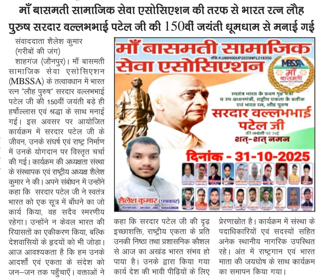 माँ बासमती सामाजिक सेवा एसोसिएशन की तरफ भारत रत्न लौह पुरुष सरदार वल्लभभाई पटेल जी की 150वीं जयंती धूमधाम से मनाई गई शैलेश कुमार तहसील संवाददाता – शाहगंज/जौनपुर गरीबों की जंग शाहगंज (जौनपुर) माँ बासमती सामाजिक सेवा एसोसिएशन (MBSSA) के तत्वावधान में भारत रत्न “लौह पुरुष” सरदार वल्लभभाई पटेल जी की 150वीं जयंती बड़े ही हर्षोल्लास एवं श्रद्धा के साथ मनाई गई। इस अवसर पर आयोजित कार्यक्रम में सरदार पटेल जी के जीवन, उनके संघर्ष एवं राष्ट्र निर्माण में उनके योगदान पर विस्तृत चर्चा की गई। कार्यक्रम की अध्यक्षता संस्था के संस्थापक एवं राष्ट्रीय अध्यक्ष श्री शैलेश कुमार ने की। अपने संबोधन में उन्होंने कहा कि सरदार पटेल जी ने स्वतंत्र भारत को एक सूत्र में बाँधने का जो कार्य किया, वह सदैव स्मरणीय रहेगा। उन्होंने न केवल भारत की रियासतों का एकीकरण किया, बल्कि देशवासियों के हृदयों को भी जोड़ा। आज आवश्यकता है कि हम उनके आदर्शों एवं एकता के संदेश को जन-जन तक पहुँचाएँ। वक्ताओं ने कहा कि सरदार पटेल जी की दृढ़ इच्छाशक्ति, राष्ट्रीय एकता के प्रति उनकी निष्ठा तथा प्रशासनिक कौशल से आज का अखंड भारत संभव हो पाया है। उनके द्वारा किया गया कार्य देश की भावी पीढ़ियों के लिए प्रेरणास्रोत है। कार्यक्रम में संस्था के पदाधिकारियों एवं सदस्यों सहित अनेक स्थानीय नागरिक उपस्थित रहे। अंत में राष्ट्रगान एवं भारत माता की जयघोष के साथ कार्यक्रम का समापन किया गया।