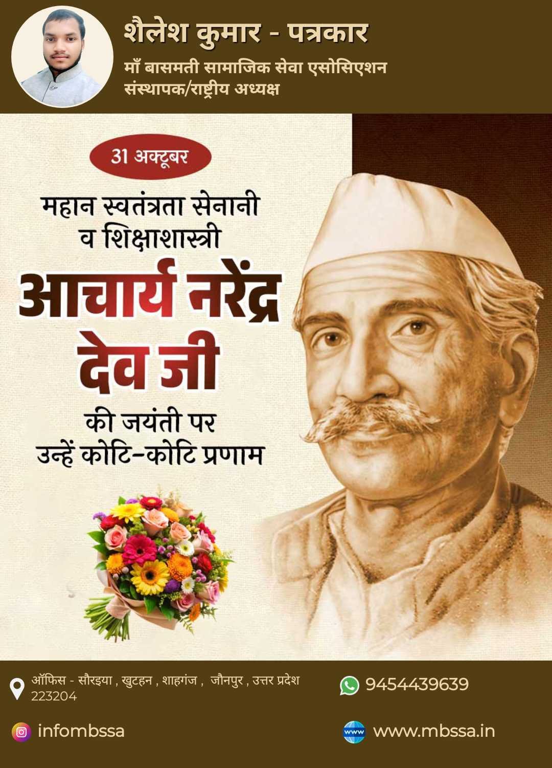 31 अक्टूबर आज हम महान स्वतंत्रता सेनानी व शिक्षाशास्त्री आचार्य नरेंद्र देव जी की जयंती पर उन्हें कोटि-कोटि नमन करते हैं 🙏 उन्होंने अपने विचारों और आदर्शों से देश को नई दिशा दी। हम सबको उनके बताये मार्ग पर चलकर समाज और राष्ट्र की सेवा के लिए सदैव तत्पर रहना चाहिए। जय हिन्द 🇮🇳 जय भारत 🇮🇳 ✍️ शैलेश कुमार – पत्रकार संस्थापक / राष्ट्रीय अध्यक्ष माँ बासमती सामाजिक सेवा एसोसिएशन (MBSSA) --- 🔖 हैशटैग्स: #MBSSA #AcharyaNarendraDev #NarendraDevJayanti #SwatantrataSenani #ShaileshKumar #SocialService #Educationist #RespectToFreedomFighter #राष्ट्रीय_नायक #जय_हिंद #MBSSAFoundation #MBSSAFamily