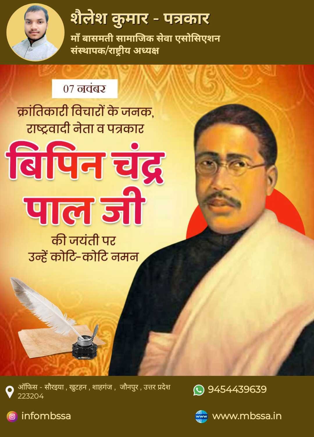 आज क्रांतिकारी विचारों के जनक, राष्ट्रवादी नेता एवं प्रखर पत्रकार बिपिन चंद्र पाल जी की जयंती के अवसर पर माँ बासमती सामाजिक सेवा एसोसिएशन (MBSSA) परिवार की ओर से श्रद्धापूर्वक नमन किया गया। संस्था के संस्थापक / राष्ट्रीय अध्यक्ष श्री शैलेश कुमार (पत्रकार) ने कहा कि — > “बिपिन चंद्र पाल जी भारतीय स्वतंत्रता आंदोलन के ऐसे महानायक थे जिन्होंने देश में राष्ट्रीय चेतना, आत्मनिर्भरता और स्वाभिमान का भाव जगाया। उनके विचार आज भी देशभक्ति और सेवा भावना का प्रेरणास्रोत हैं। हमें उनके आदर्शों पर चलकर समाज और राष्ट्र के निर्माण में योगदान देना चाहिए।” इस अवसर पर उपस्थित सदस्यों एवं कार्यकर्ताओं ने माल्यार्पण कर श्रद्धा सुमन अर्पित किए तथा उनके पदचिह्नों पर चलने का संकल्प लिया। कार्यक्रम का संचालन संस्था के पदाधिकारियों द्वारा किया गया एवं अंत में राष्ट्रगान के साथ श्रद्धांजलि सभा का समापन हुआ। शैलेश कुमार – पत्रकार संस्थापक / राष्ट्रीय अध्यक्ष माँ बासमती सामाजिक सेवा एसोसिएशन (MBSSA) 📍 ऑफिस: सौरईया, खुटहन, शाहगंज, जौनपुर, उत्तर प्रदेश – 223204 📞 संपर्क: 9454439639 🌐 वेबसाइट: www.mbssa.in 📧 ईमेल: mbssa2025@gmail.com